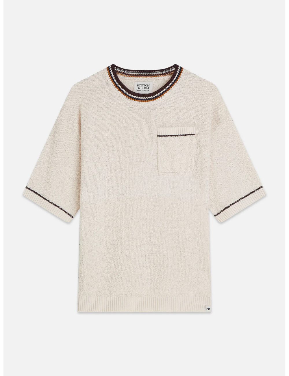 Ένα πλεκτό μπλουζάκι από μείγμα βαμβακιού-λινού, με χαλαρή εφαρμογή και ντεκολτέ σε αντίθεση, που προσφέρει μια αναβαθμισμένη καθημερινή εμφάνιση