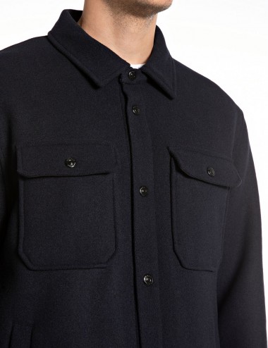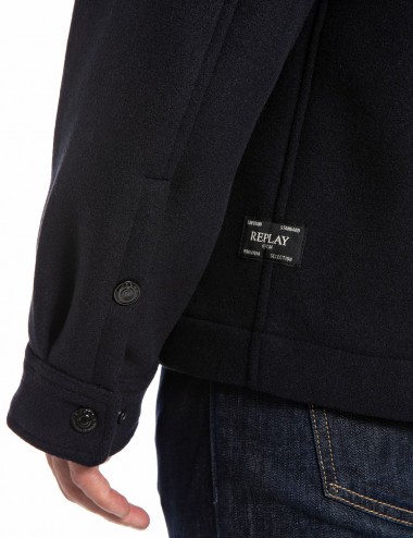 Σακάκι πουκάμισο από ύφασμα μαλλί Melton . Αυτό το ανδρικό κομμάτι διαθέτει κλείσιμο  με τρουκς στο μπροστινό μέρος, τα οποία βρίσκονται επίσης στις μανσέτες και στις μπροστινές τσέπες με το πτερύγιο, και την ετικέτα Replay στο πλάι, σύμβολο της ταυτότητας της μάρκας. Το πίσω μέρος ολοκληρώνεται από το logo Replay.