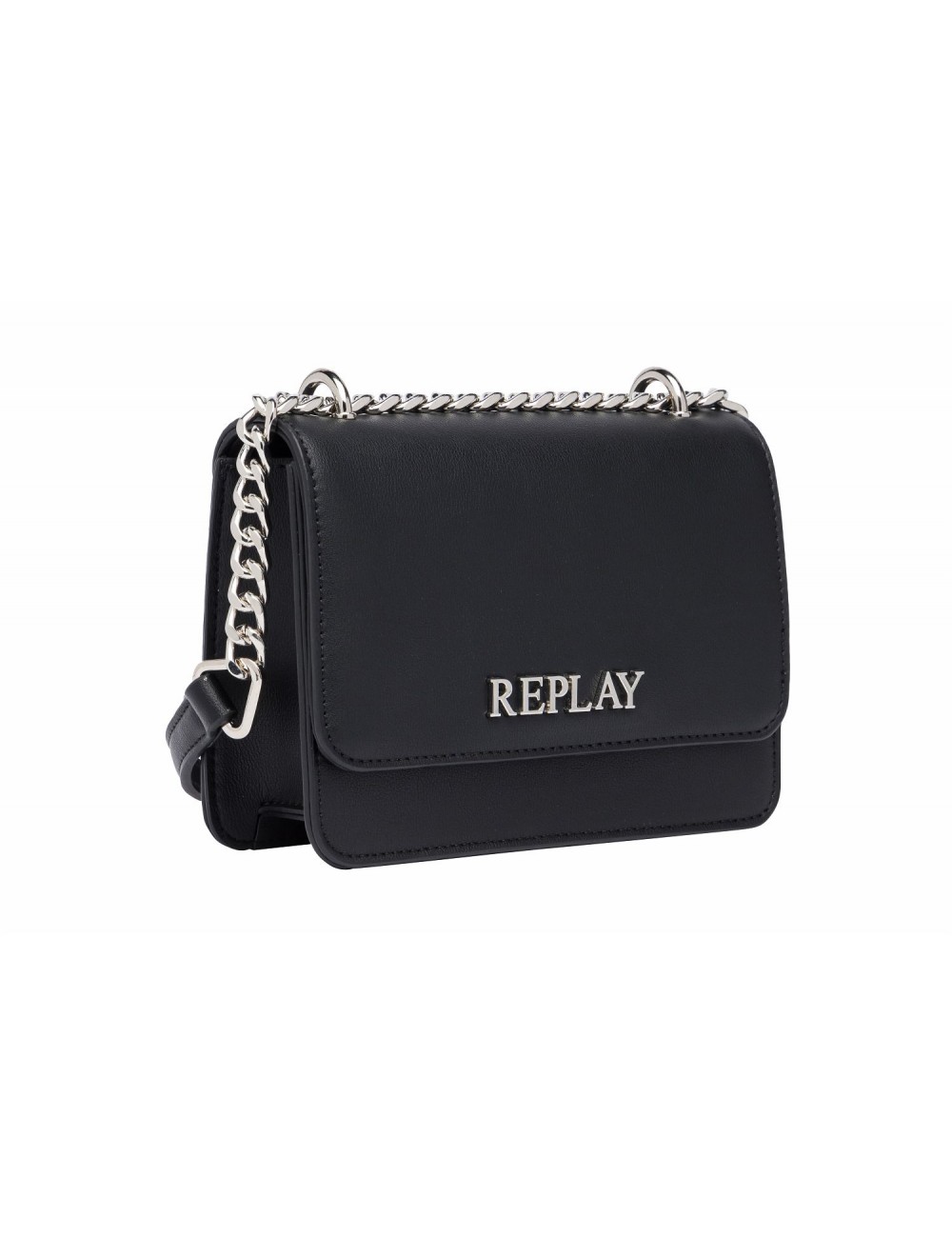 Replay women's eco leather crossbody bag with one main compartment & flap closure with magnetic clasp. Shoulder chain with adjustable part & decorative stars. Metal Replay logo on the front.