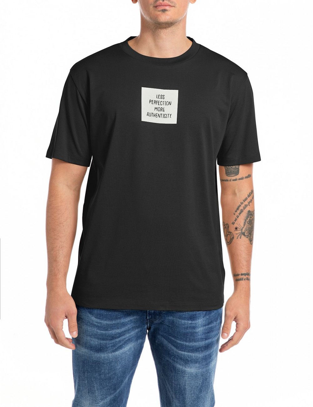 Crew neck t-shirt in cool organic cotton jersey, eco-friendly material. This regular fit short sleeve t-shirt for men features lettering on the chest and an external logo tag on the sleeve