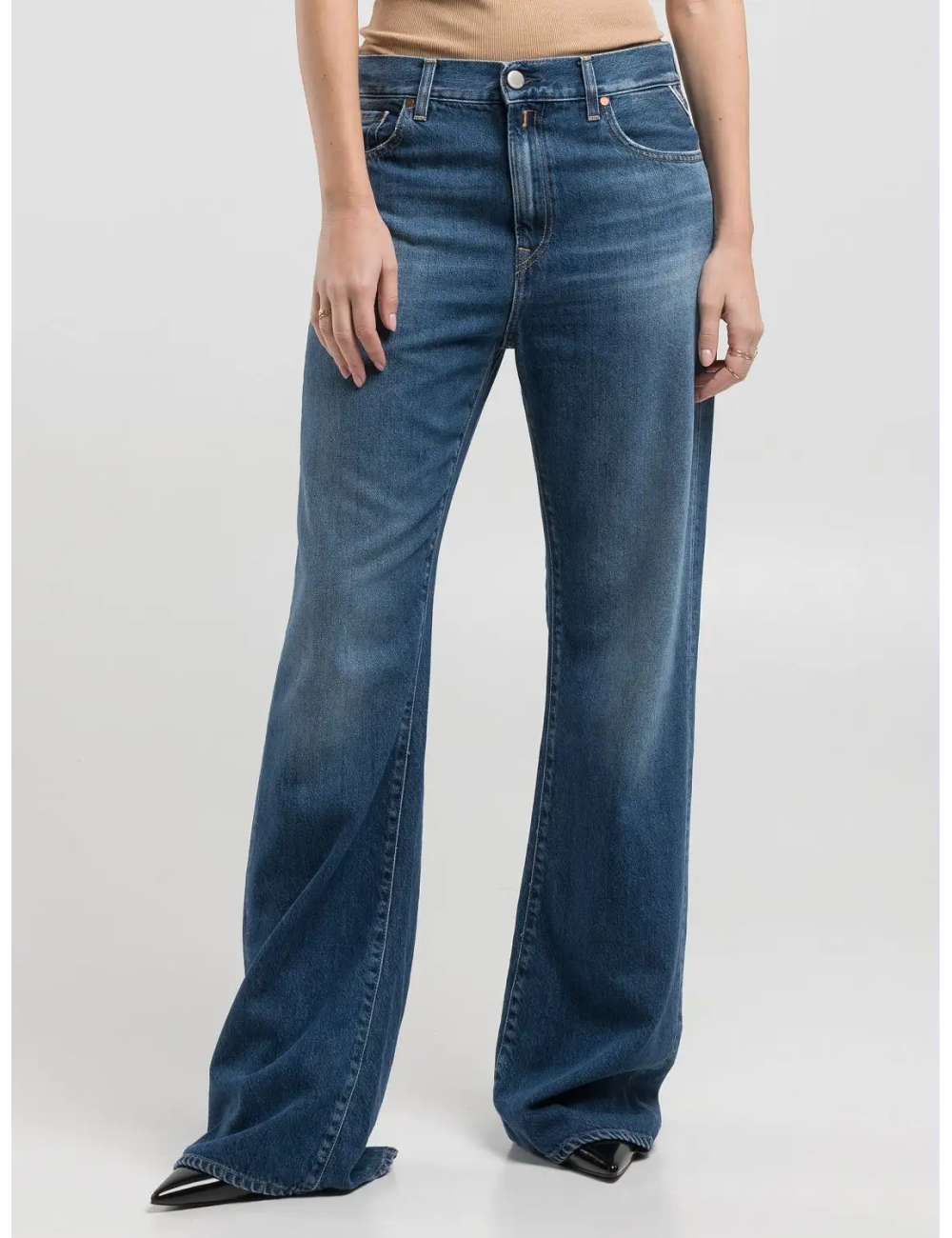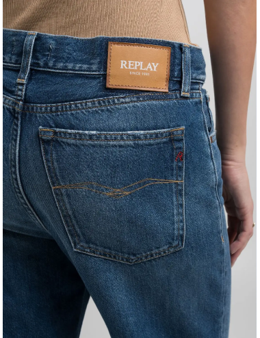 Women's regular-rise five-pocket jeans featuring hand-made moustaches and scuffing, as well as slight rips on the pockets and hem that create a contrasting color in the areas of wear. The back pockets have our signature gull-wing stitching and one pocket has an R embroidery, while one of the front pockets has a small branded insert. Zip and button closure.